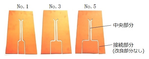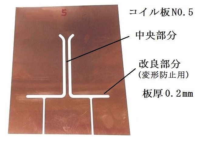 ●従来用いた平板状5ターンコイル(E字形コイル)は,構成する5枚の各コイル板板厚は0.5mm,コイル全体の厚さは3mm以上であり, 材質はクロム銅C3243(導電率80%,引張強さ380N/mm 2 )であった. 今回用いる弾力のある薄い5ターンコイル板5枚(E字形コイル)の各板厚は0.2mm,コイル全体の厚さは約2mmである. コイル板の材質はコルソン銅C7025(導電率45%,引張強さ740N/mm 2 )である. 引張強さが大きく,バネのように弾力があり,変形しにくい.各コイル板形状は前実験で用いた10ターンコイルのコイル板(No.1〜No.5)と同じである. ここでの薄いコイルでは,コイル各板の板厚(0.2mm)が各板へ流れる高周波振動電流の表皮深さ(約0.4mm)に比べて小さい. コイル全体の厚さは,表9.1の2〜6ターンコイルに比べて薄い.
