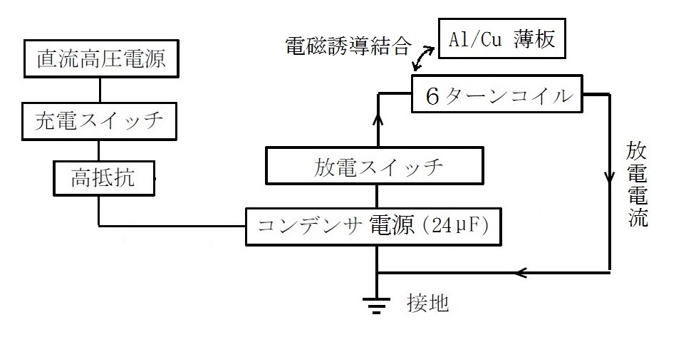 2つの放電スイッチで直列に放電する.放電時のコンデンサ電源容量は6μFに減少する.この放電電流がインダクタンスの大きい8ターンコイルへ急激に流れる.