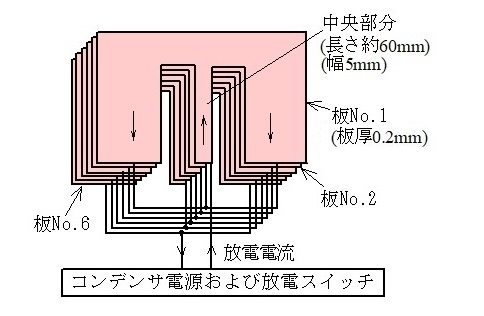 ●直線状に圧接(シーム溶接)する平板状6ターンコイル用のコンデンサ放電装置構成図を図9.1に,放電回路(外観)を図9.2に示す. コンデンサ電源(コンデンサ4台並列接続,並列容量24μF),放電ギャップスイッチ(付録18参照)および6ターンコイルは図9.2のように配置され,放電回路を構成する. 放電回路上側の固定具,絶縁材の一部は取り外されている.6ターンコイル(各コイル板)の概略図を図9.3に示す.概略図の場合,コイルは それぞれ絶縁された6枚のコイル板(No.1〜No.6)からなり,ぴったり重なっている.電流は板No.1 の細長い中央部分(幅5mm)へ上向きに流入し, 幅の広い両側の周辺部分から下向きに戻る.この電流は板No.1の下部で合流し,再び板No.2 の中央部分を上向きに流れる.電流はこのようなターンを6回繰り返し, 板N0.6の周辺部から流出する.コイル中央部分には,電流が6層に重なって直列に流れる. このようなコイルおよび圧接する薄板(アルミ,銅薄板)の固定する例を図9.4(断面図)に示す. 6ターンコイルにすると,従来のワンターンコイルに比べ,圧接に必要なコイル電流は約1/6に減少し,コイル(中央部分)には同様の高密度磁束が発生する. ただし,各コイル板同士の配線接続では,図9.3のように細い線などを使ったコイル板同士の外部での配線はされない.理由は,細い線などを使った配線部分のインダクタンスが 大きくなり,電源エネルギーがコイル中央部分(高密度磁束発生部分)へ効率的に移送されないからである. 詳細はこちら に示されている.