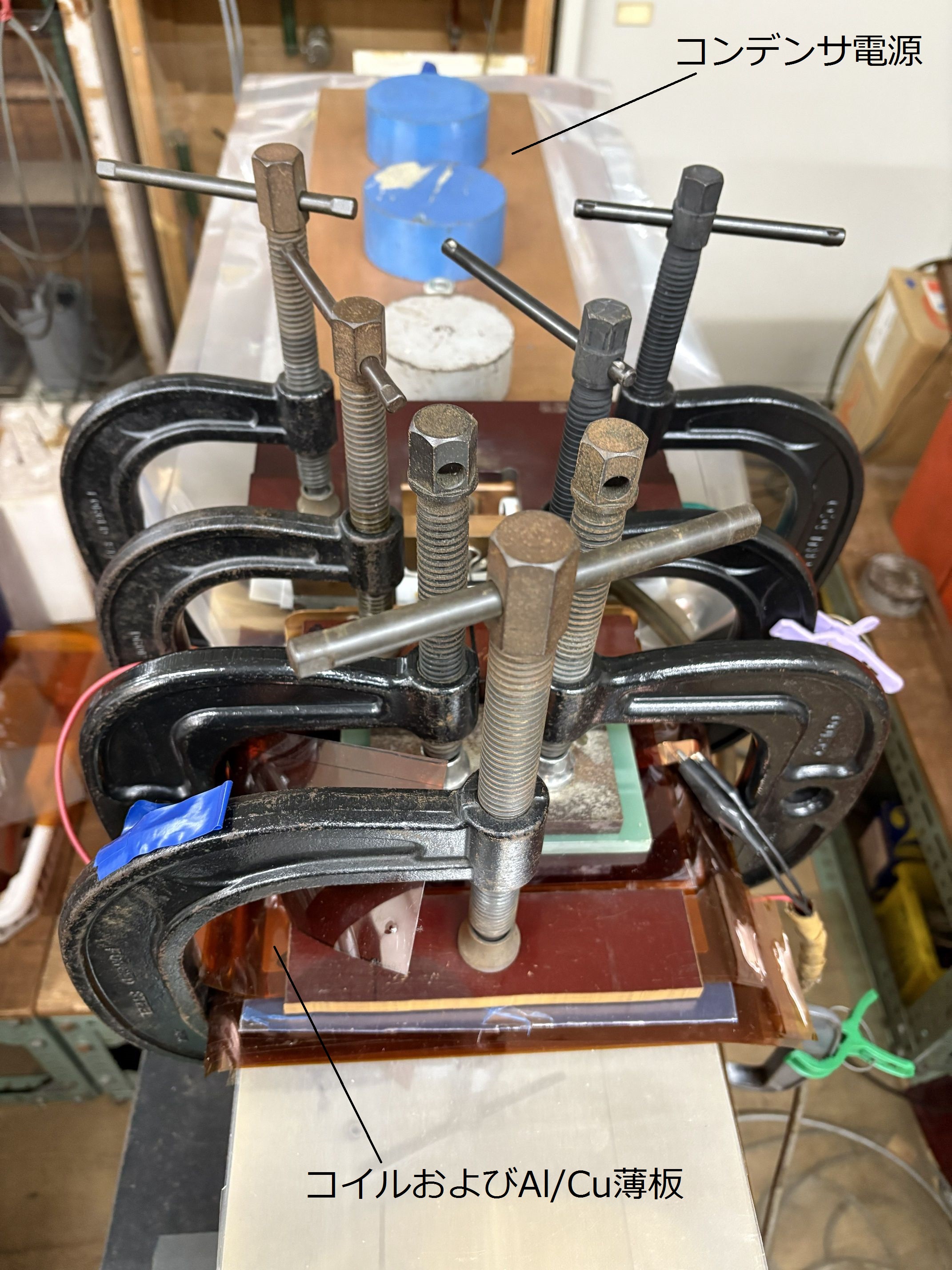 図9.33 薄い5ターンコイルを用いたアルミ/銅薄板電磁圧接装置の構成図