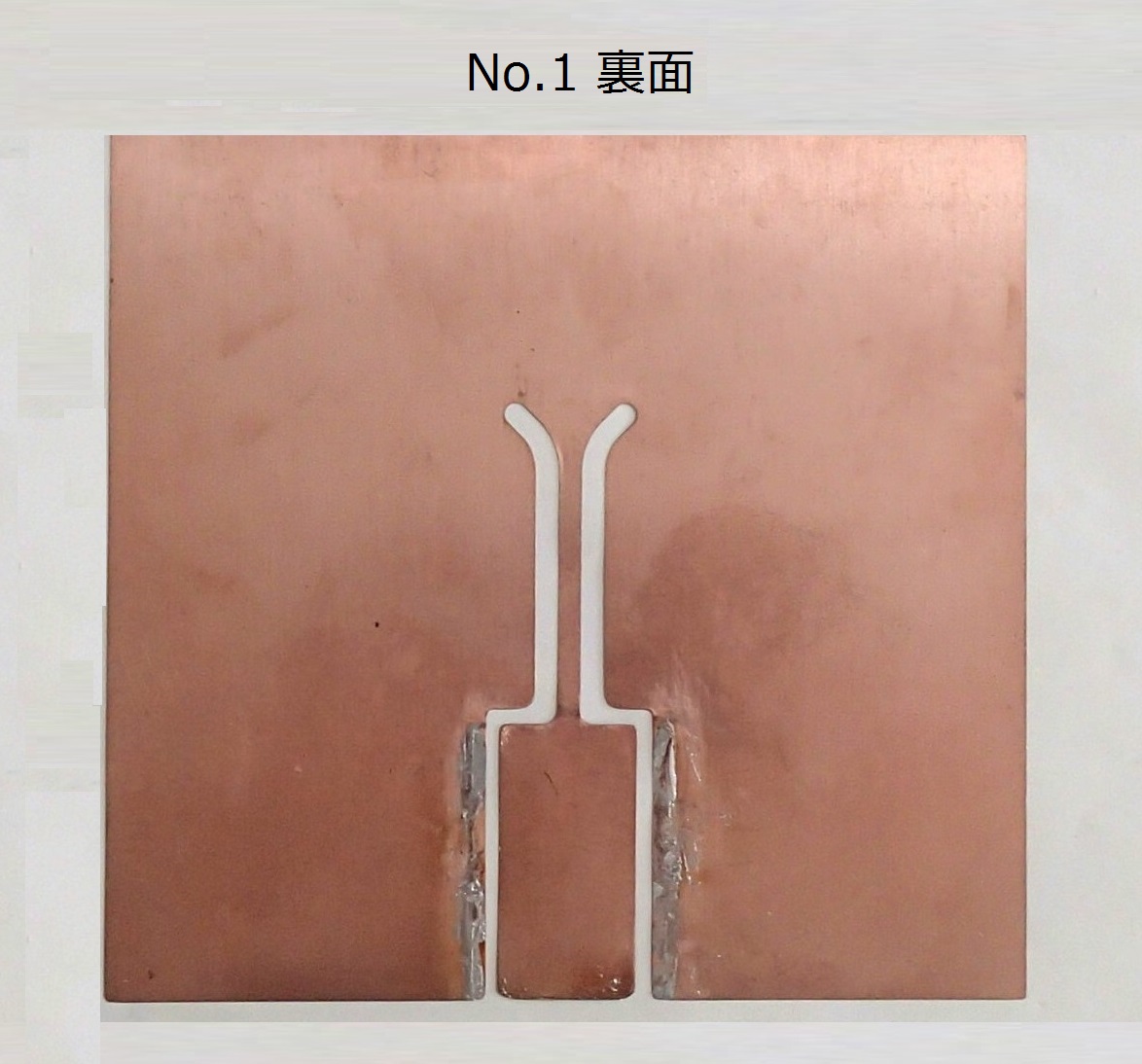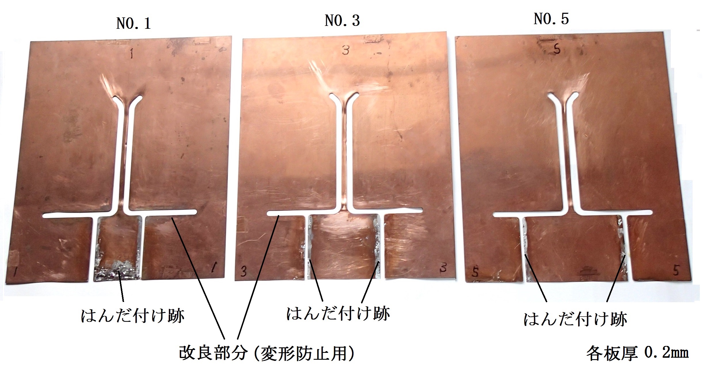 ●溶接実験回数約40回後のコイル外観写真例を図9.8に示す. 約40回実験後に分解した各コイル板(図9.8の左図上面側)の外観例を図9.9に示す.はんだ付けした部分(はんだ付け跡)は各コイル板下部の両側に分かれて生じている. 各板裏面でのはんだ付け位置(跡)は,例えば板No.3のように上面と異なる. このようにコイル板同士を直接はんだ付けするため,各コイル板下部の形状(はんだ付けする部分)は異なっている. コイルの外側に図9.3(概略図)のような細い接続用配線は使われない. 板No.1に示す矢印は変形が比較的に大きい部分である.同じく,板No.1両面の拡大写真を図9.10に示す. これらのコイル板を再び組立てて使用することはできるが,同様の実験を続けられる回数は10数回と思われる.